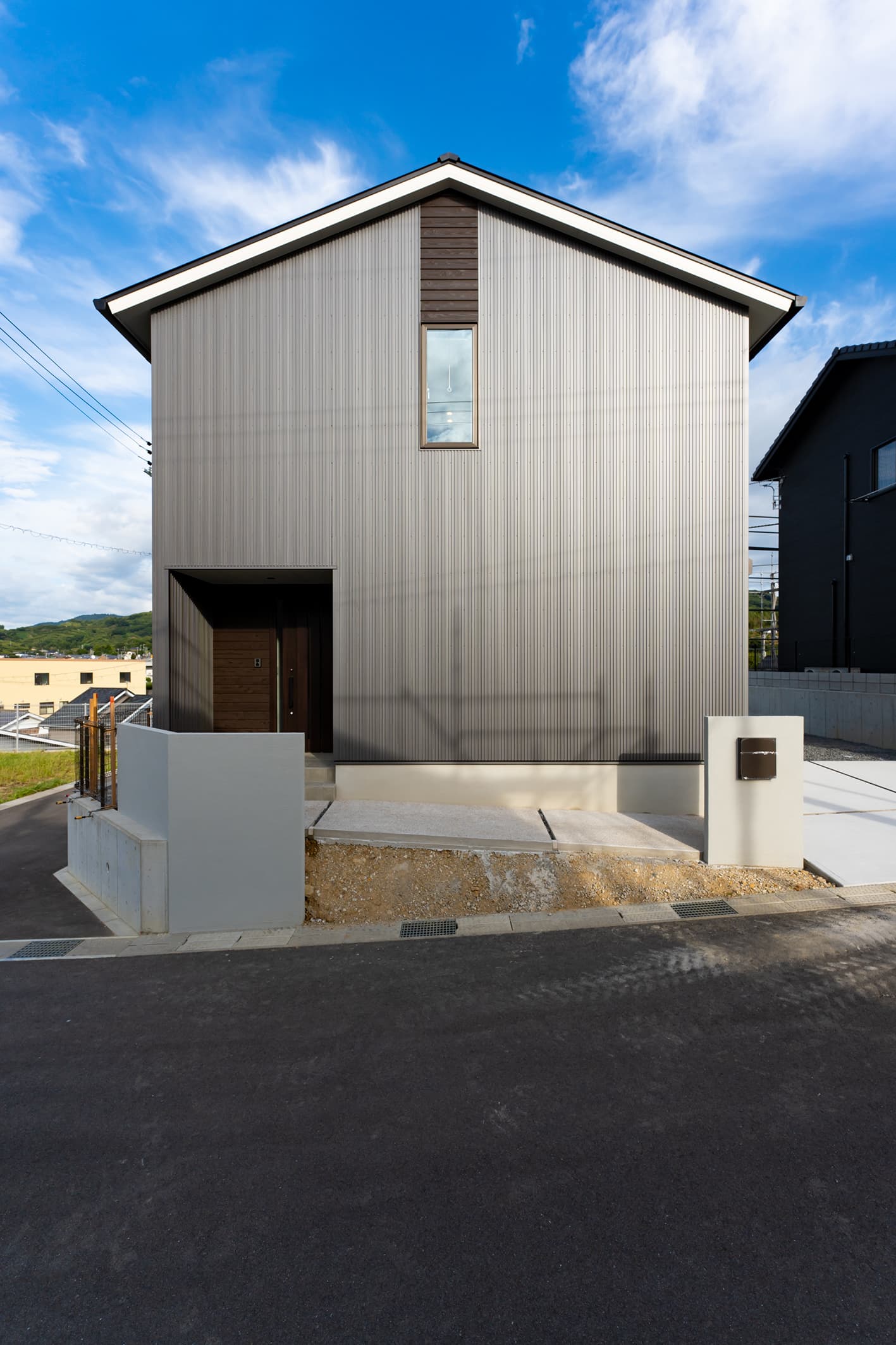 外観は中央の窓を中心にシンメトリーに、かつガルバリウム外壁特有のシームレスさを活かしたデザインとしました。これを継ぎ目のある一般的な窯業系サイディングでやると、とてつもなくチープでダサい外観になってしまいます。また中央の窓から棟(屋根の中央)に向かって本物の杉板をアクセントに挿し、和モダンの雰囲気を強調しました。このお家のデザイン手法は著名建築家の飯塚豊先生の作風をオマージュしており、極めてシンプルでありながら非常に美しく、印象に残りやすいデザインであると思います。「カッコいい」ではなく「美しい」と形容すべきデザインです。