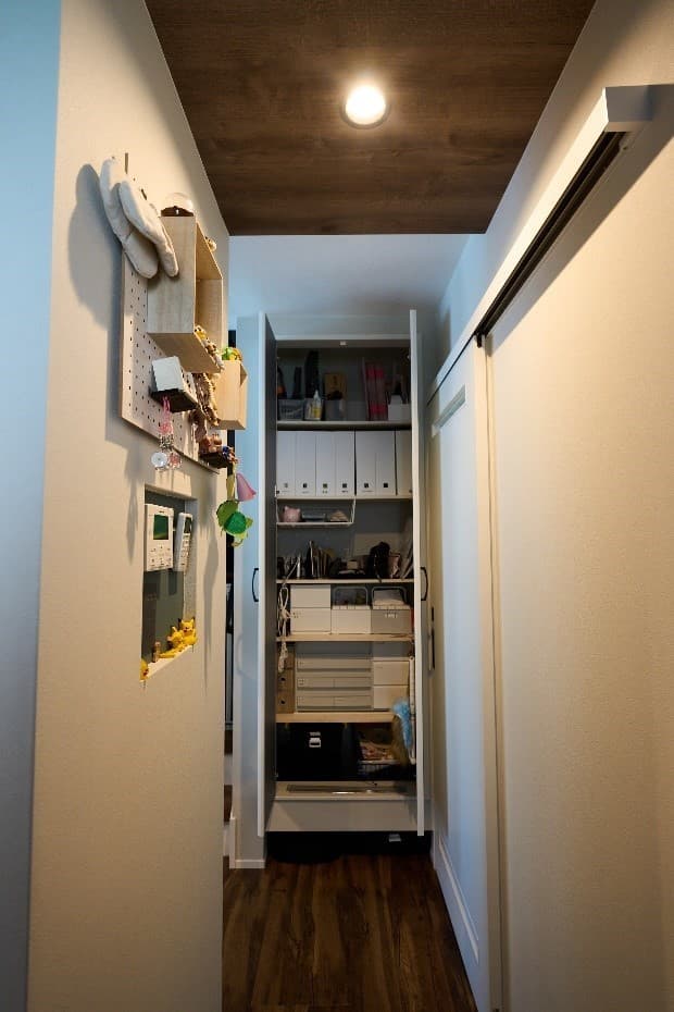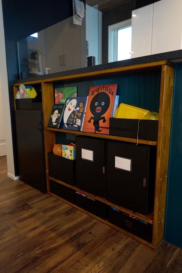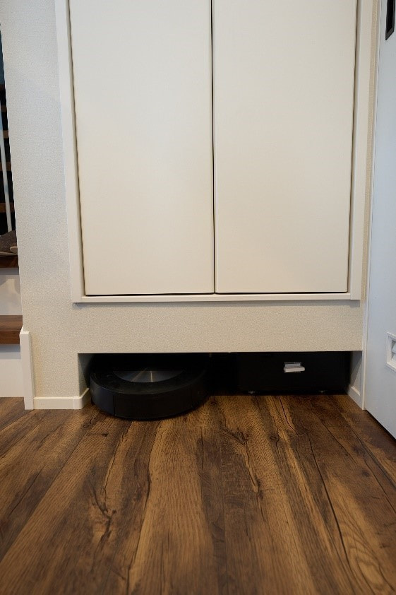 うちは動物がいるので毛がすごいんですよ。ルンバは最初から購入予定で今も毎日大活躍です。僕たちは設計の段階でここに基地を作ってください、とお願いして作ってもらいました。あらかじめ収納のしたに隠しこんでしまえるようにしたことで見た目にも、場所的にもスッキリして気に入っています。