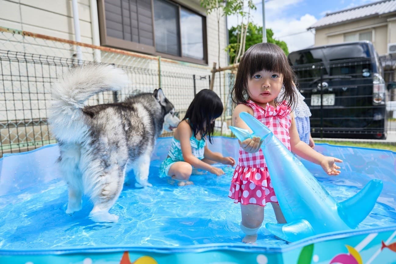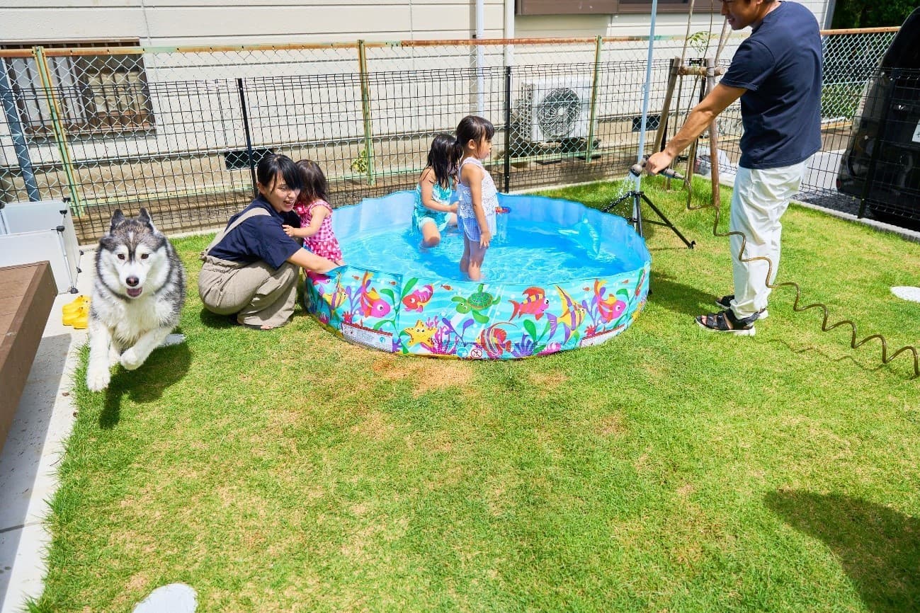 こどもたちも庭で遊べるし、夏はプールをしたりしておうちでも楽しく遊べます。