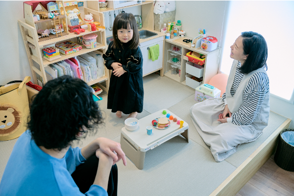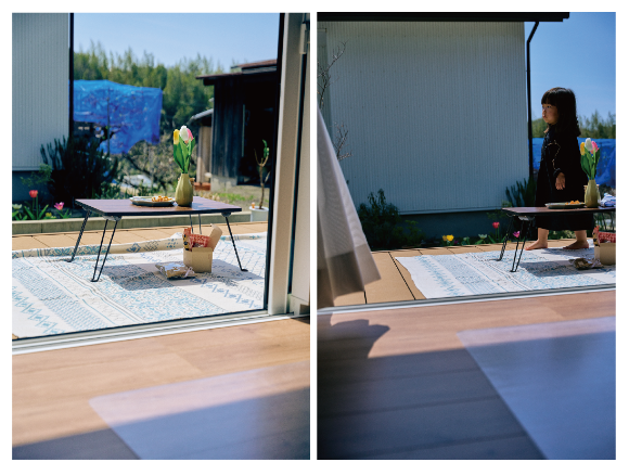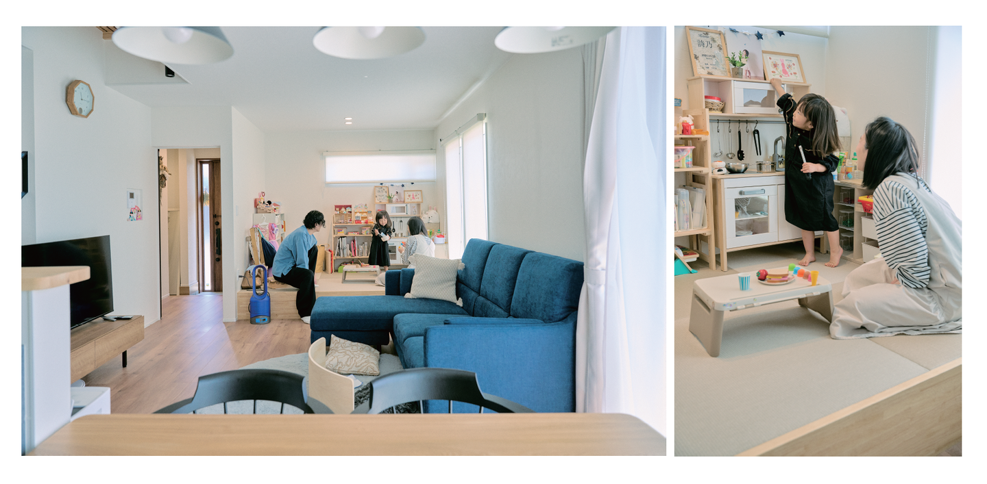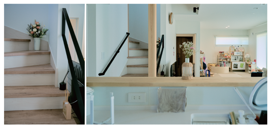 キッチンでごはんを作りながらお庭のようすも、おうちの中で遊んでいるようすも見ることができて安心です。